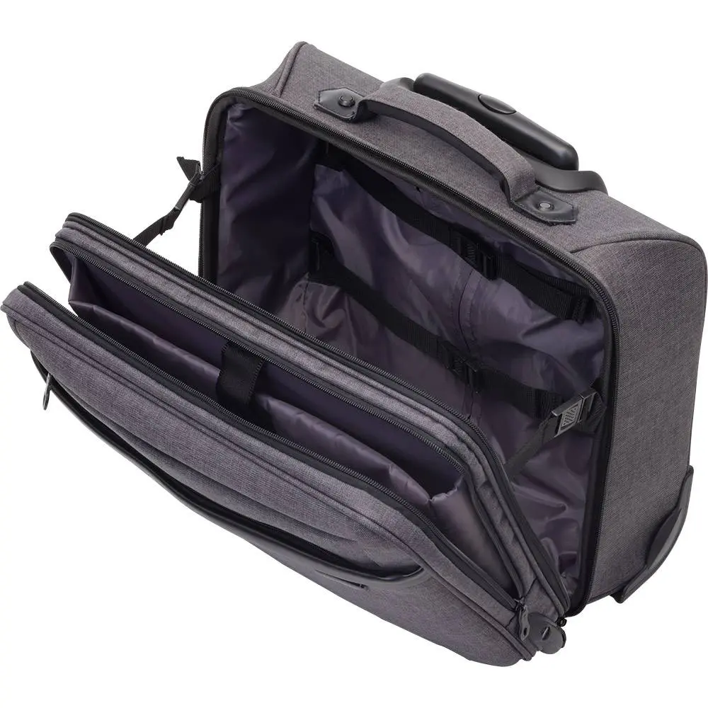 Business laptop trolley met kwaliteitswielen, hoofdcompartiment met rits met gevoerd compartiment met drie vakken, compartiment met rits met organiser vak met twee pennenhouders, drie visitekaartvakken, klein vak, twee compartimenten met rits vooraan, verborgen adreslabel op de achterzijde, met trolleyriem.