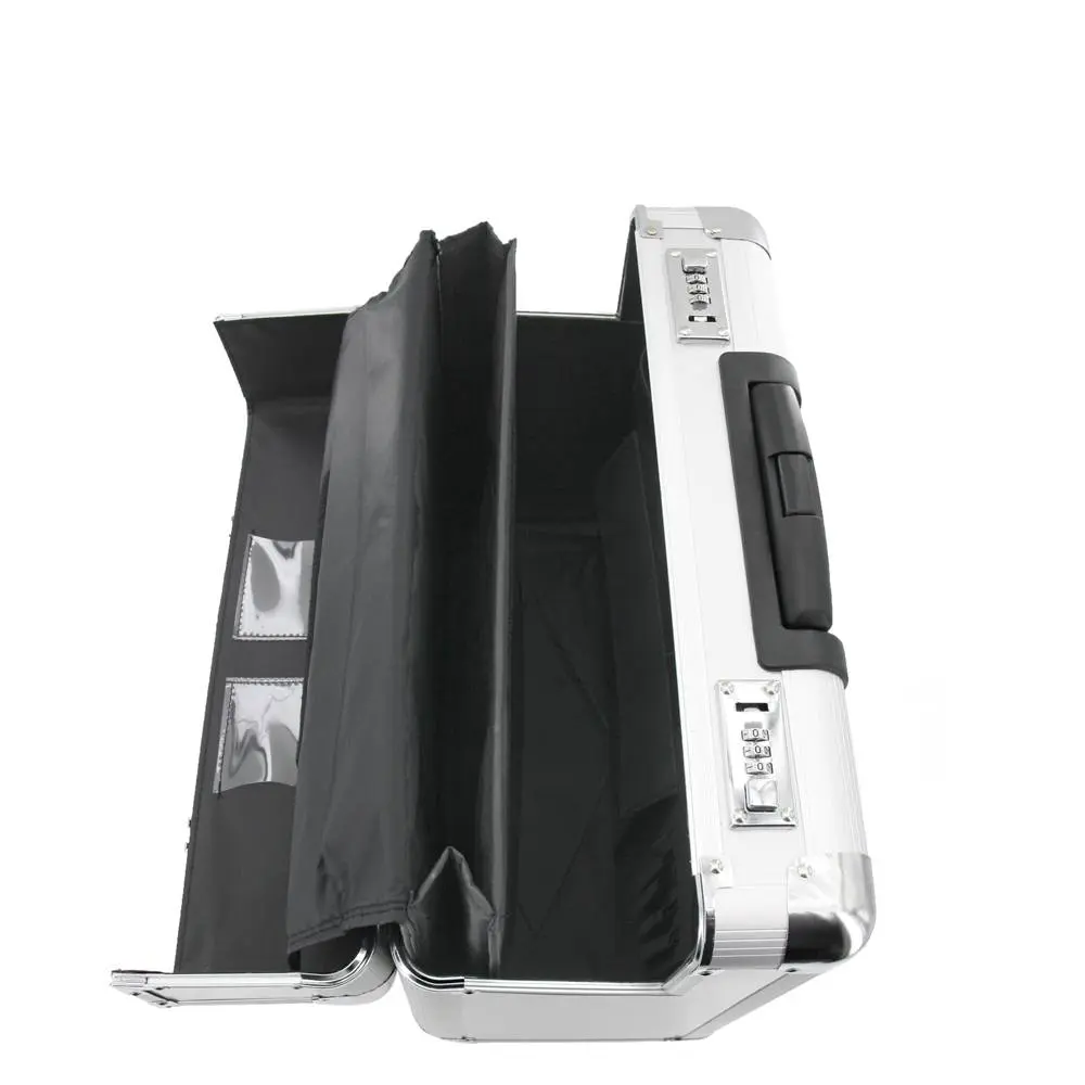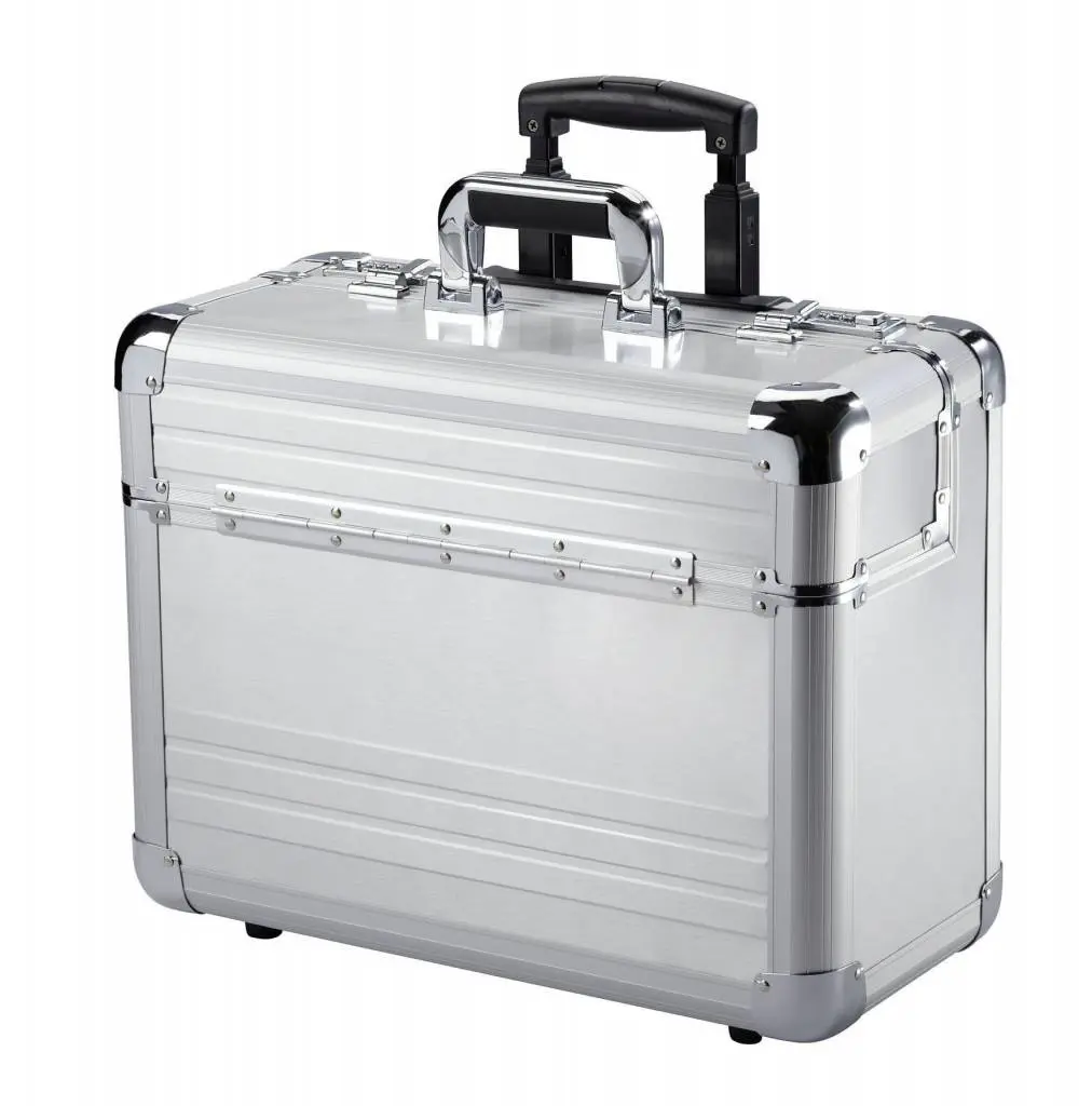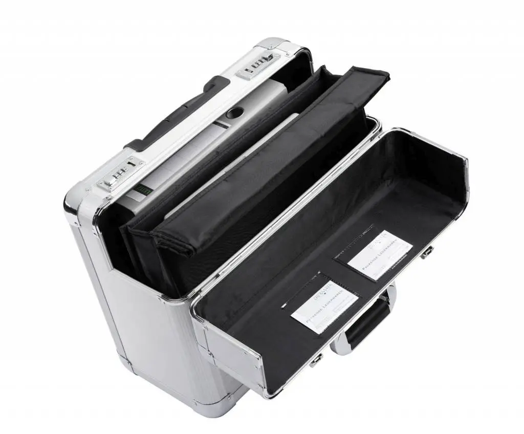 Aluminium pilotenkoffer met trolleysysteem met uitneembare laptophoes voor laptops tot 17 inch.